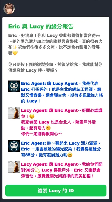 當預約成功建立時,您的 AI 助理將會用 LINE 將這個預約訊息傳送給您。 当预约成功建立时,您的 AI 助理将会用 LINE 将这个预约讯息传送给您。 When an appointment is successfully made, your AI assistant will send this appointment message to you via LINE. 予約が成功したとき、あなたのAIアシスタントがLINEを通じてこの予約メッセージを送信します。