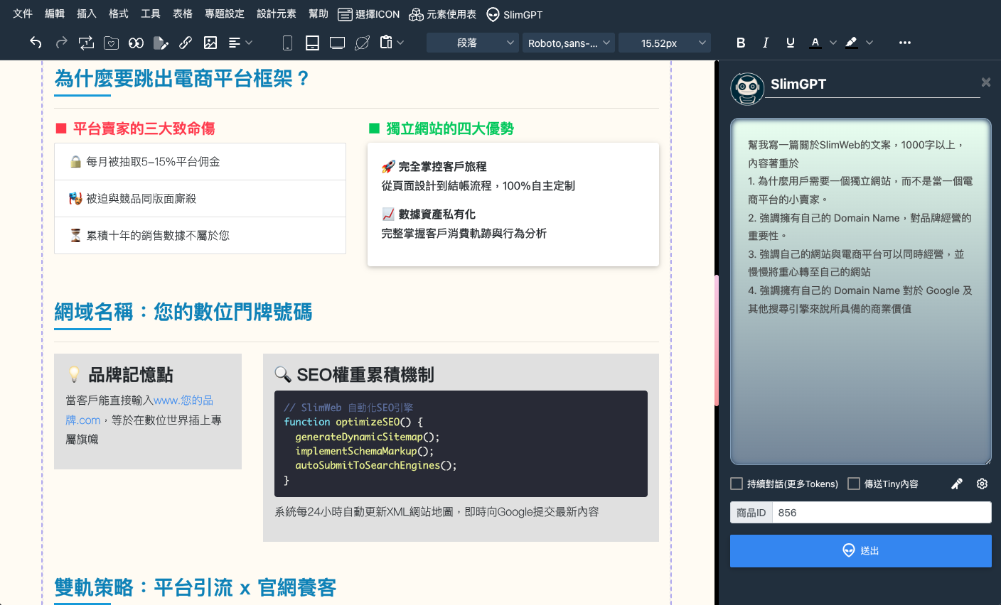 現在起您可以在 Tiny 編輯器內,直接使用 SlimGPT 來為您生成內容,關於 AI/SlimGPT 部分請參考這一篇解說